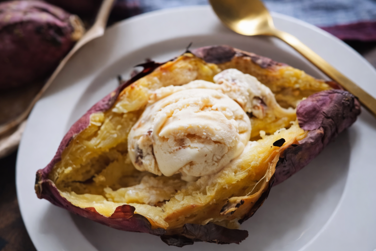 薪ストーブの中でじっくり焼き上げたアツアツ&ホクホクの焼き芋に、ひんやりアイスをトッピング♪