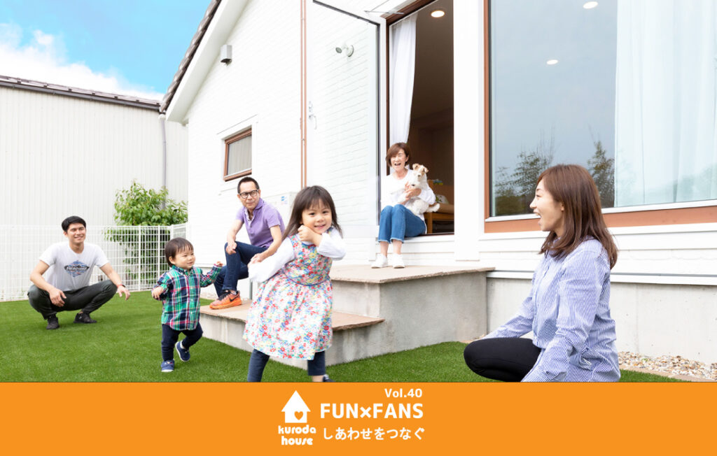 FUNは「楽しみ、喜び、面白さ」、FANSは「熱心な愛好者、支持者」という意味です。真ん中のバイは記号の×(かける)、つなりFUNとFANSをつなぐ架け橋をイメージしています。私たち自身もクロダハウスの熱いファンです。